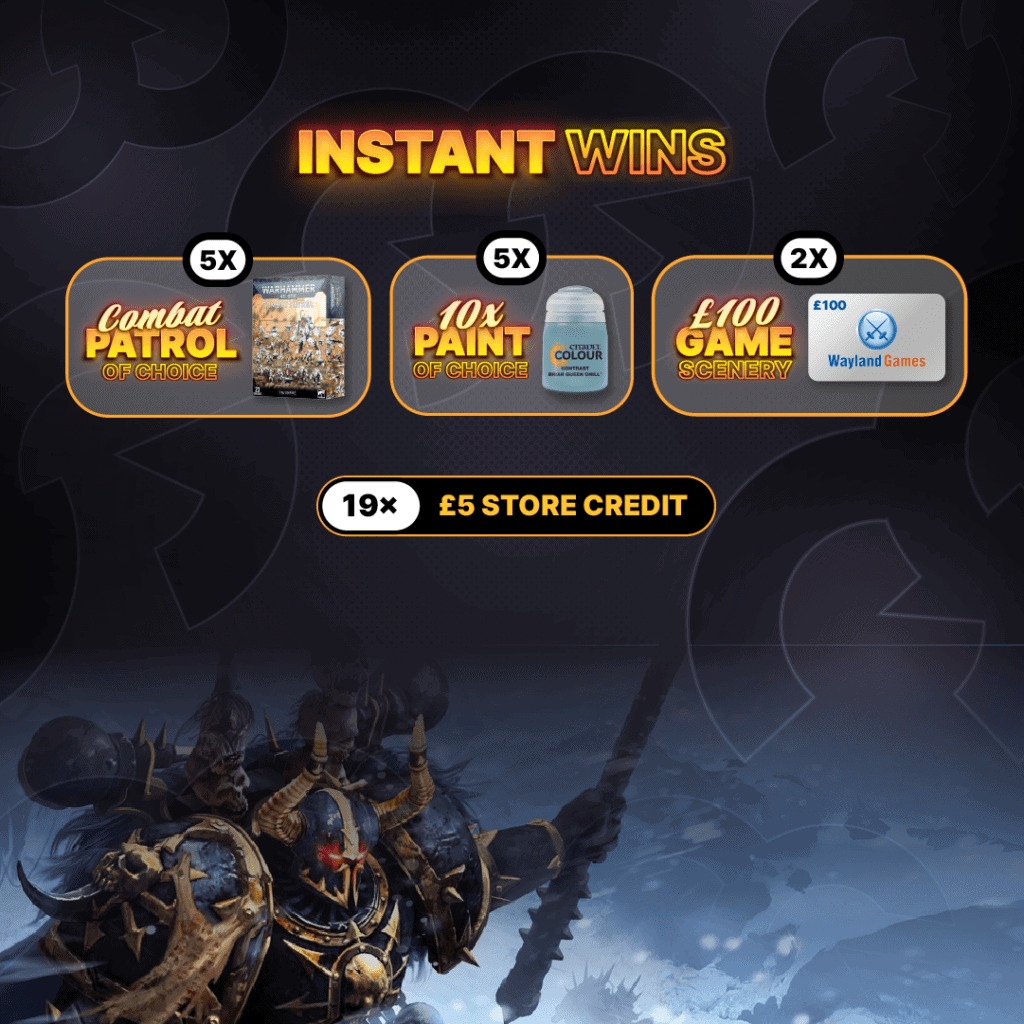 The main prize of this competition and what will be drawn during the live draw is £1000 Warhammer voucher. However, when you purchase a ticket, you can automatically win instant wins prizes detailed in the table.