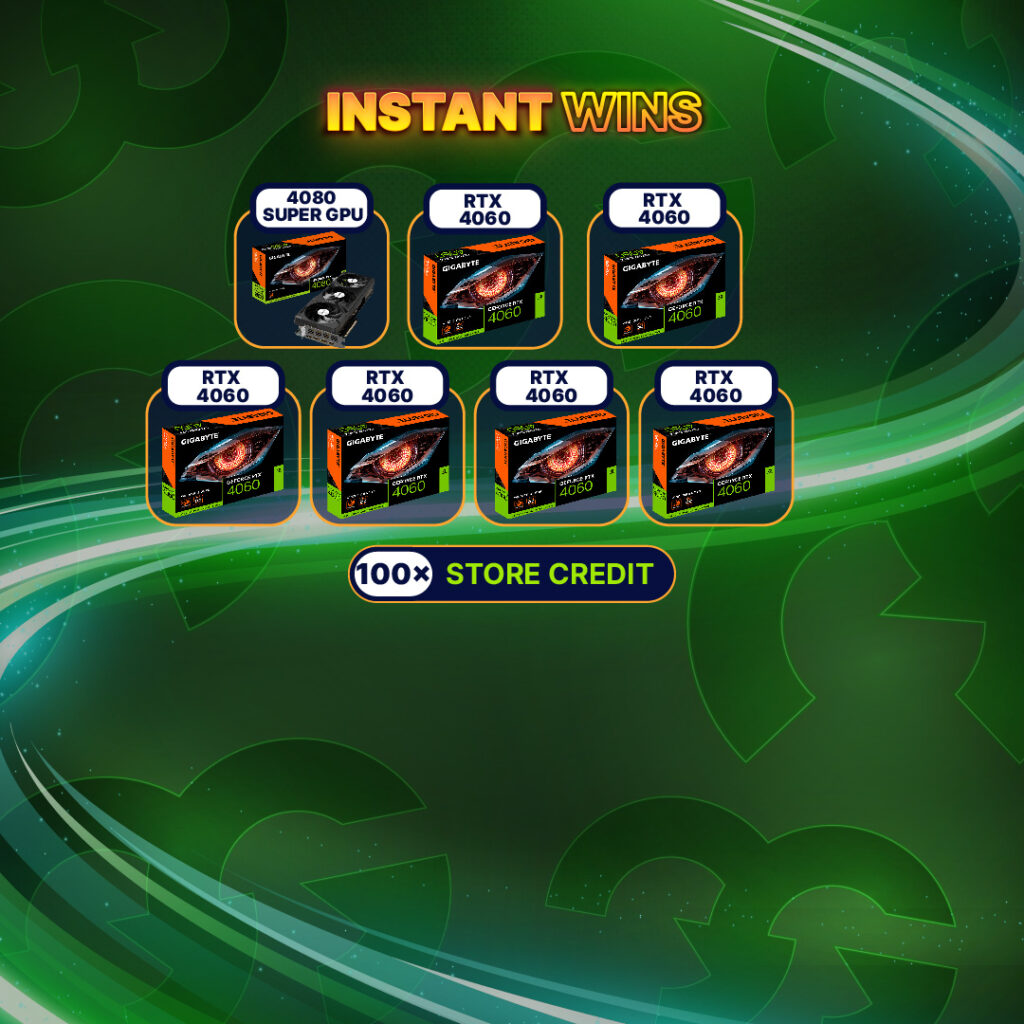 The main prize of this competition and what will be drawn during the live draw is an Gigabyte NVIDA GeForce RTX 4080 SUPER WINDFORCE V2 GPU. However, when you purchase a ticket, you can automatically win one of the 100+ instant wins prizes detailed in the table.